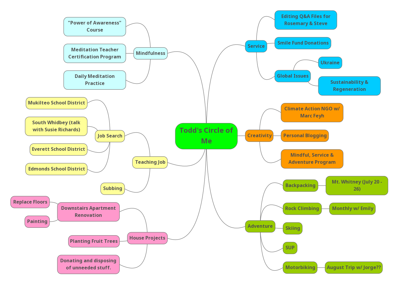 Following this mind mapping exercise, I’ll make some new goals, revisit and revise old ones, and create steps towards reaching those goals. This mind map can be revisited periodically. It might fit well with creating "new year's resolutions". But don't limit it there, it can be used anytime you have a few extra minutes to refocus and adjust some of your priorities.